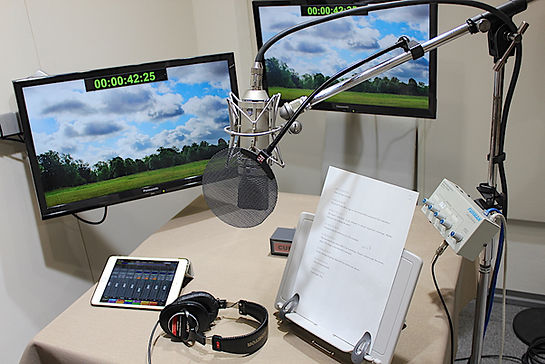 録音用のブース内は、壁面に自在に可動する24インチ液晶モニタ2台を設置し、立ち座りどちらでもナレーション、アフレコ収録が可能です。